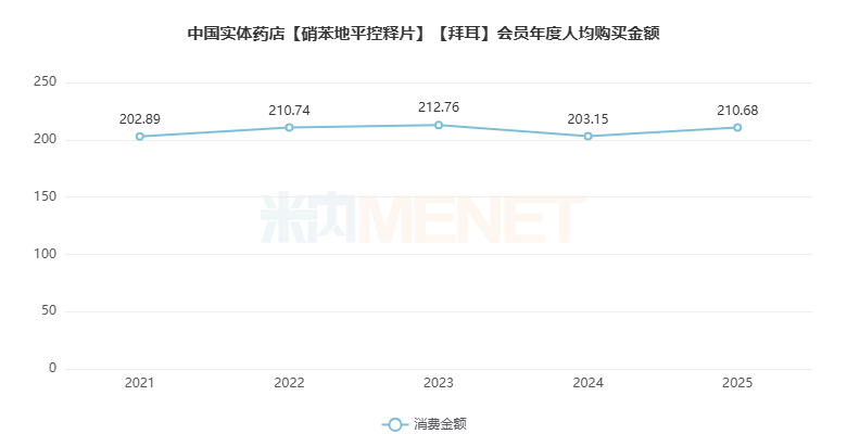 会员年度人均购买金额比较平稳,2025年人均消费210.68元。
