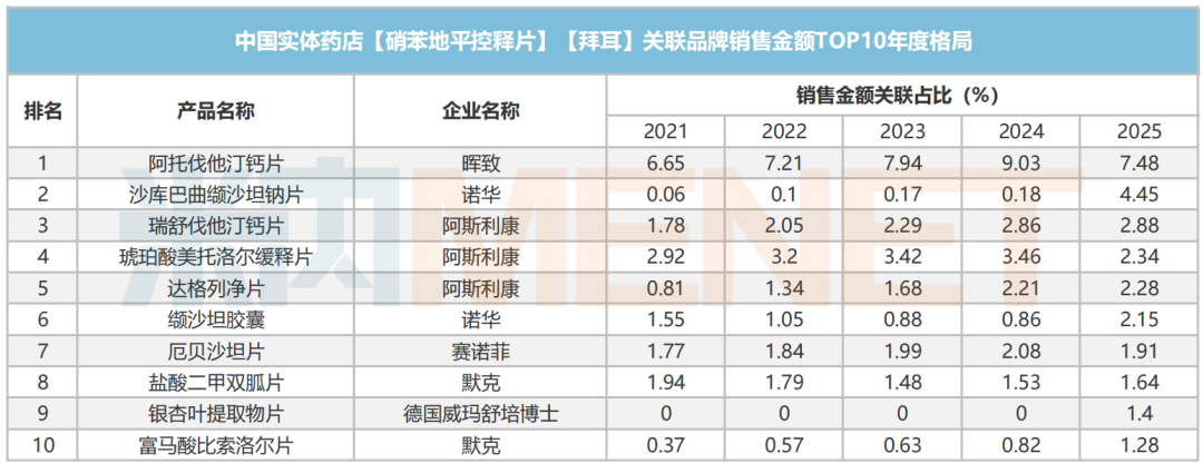 关联占比品牌方面,从销售金额进行统计,2025年排名第一的是晖致的阿托伐他汀钙片,占比7.48%。