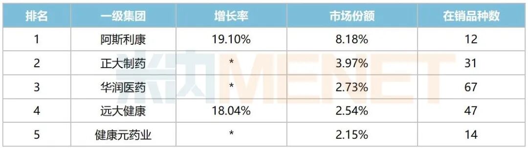 一级集团TOP10中,阿斯利康、正大制药、华润医药、远大健康、健康元药业依次位列前五,其中远大健康、健康元药业同比2024年均提升1个位次;从销售额增速看,位列第六的海思科增幅最大,同比增长约20%,较2024年提升8个位次。