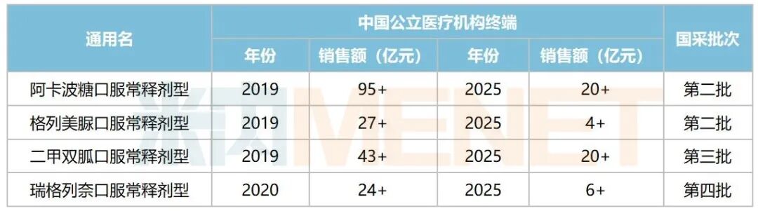 第二批集采品种阿卡波糖口服常释剂型2019年在中国公立医疗机构终端达到超95亿元的销售峰值,2020年执行后直接“腰斩”,2025年销售额约达20亿元;第四批集采品种瑞格列奈口服常释剂型2020年销售额超过24亿元,2021年执行后下滑至不足16亿元,2025年销售额约达6亿元。