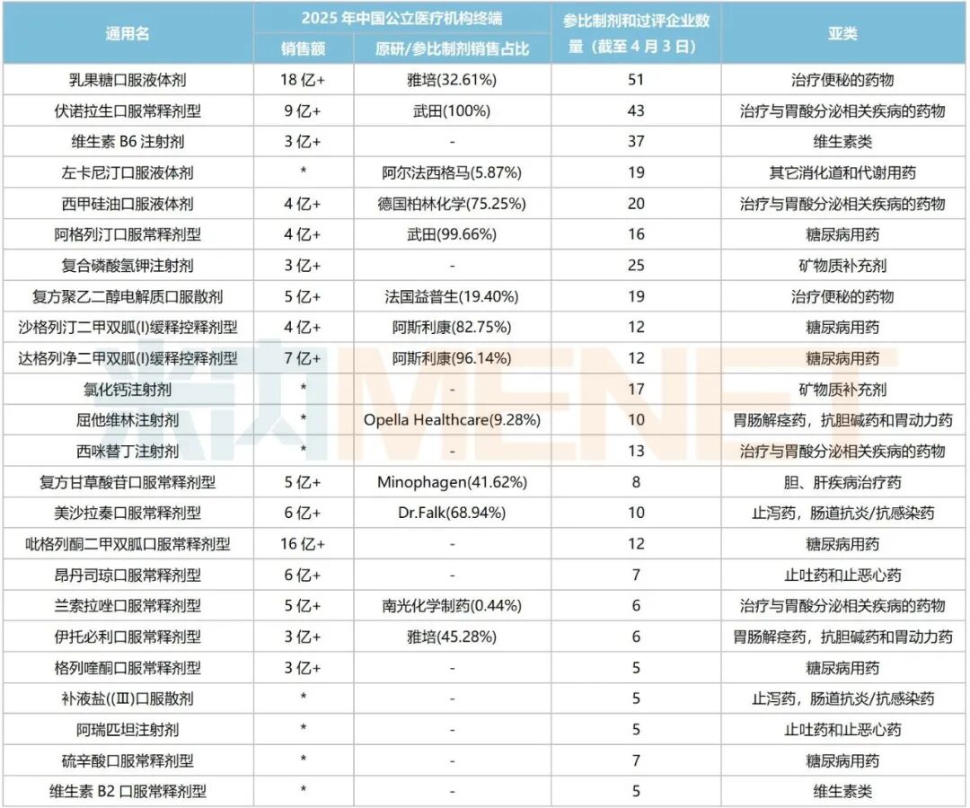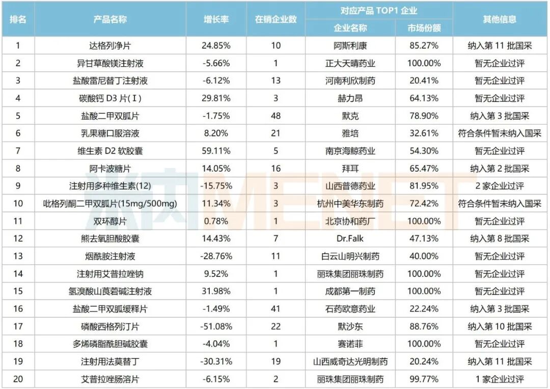 产品TOP20中,达格列净片以超90亿元稳居榜首,阿斯利康独占市场份额超八成;正大天晴的独家品种异甘草酸镁注射液以近25亿元紧接在后,较2024年提升1个位次;盐酸雷尼替丁注射液以超24亿元排位第三,目前暂无企业过评或视同过评。