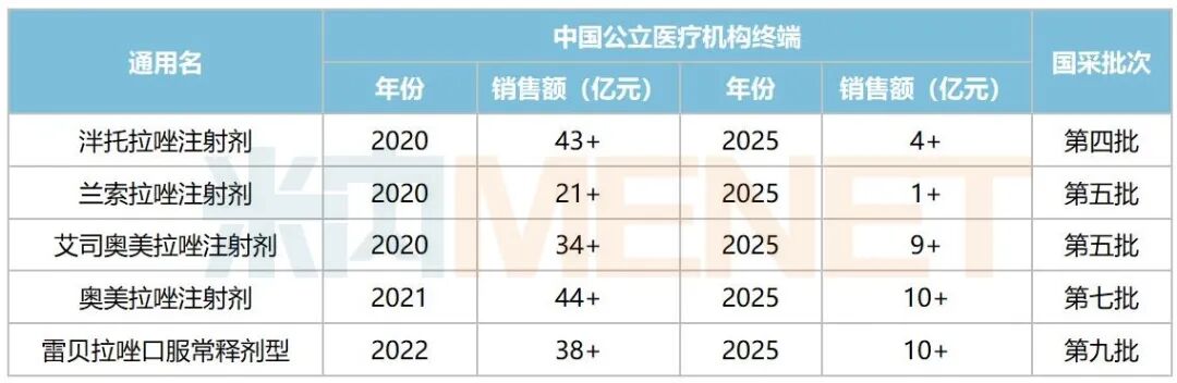 第四批集采品种泮托拉唑注射剂2020年销售额超过43亿元,2021年执行后其销售额不足20亿元,2025年不足5亿元;第五批集采品种兰索拉唑注射剂2020年销售额超过21亿元,2021年执行后其销售额约为12亿元,2025年约为1亿元;第七批集采品种奥美拉唑注射剂2021年销售额超过44亿元,2022年执行后其销售额约为31亿元,2025年约10亿元。