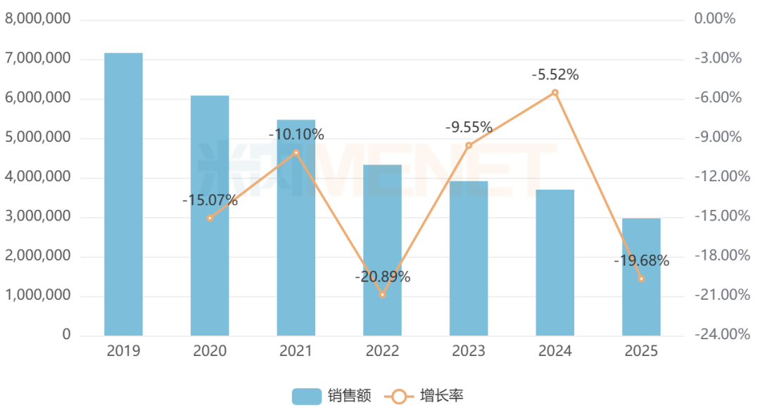2019年至今,已纳入国采的消化系统及代谢化药销售额已“蒸发”超400亿元。米内网数据显示,2019年中国公立医疗机构终端已国采的消化系统及代谢化药销售额合计超过700亿元,此后逐年下挫,2025年仅剩约300亿元的销售规模。