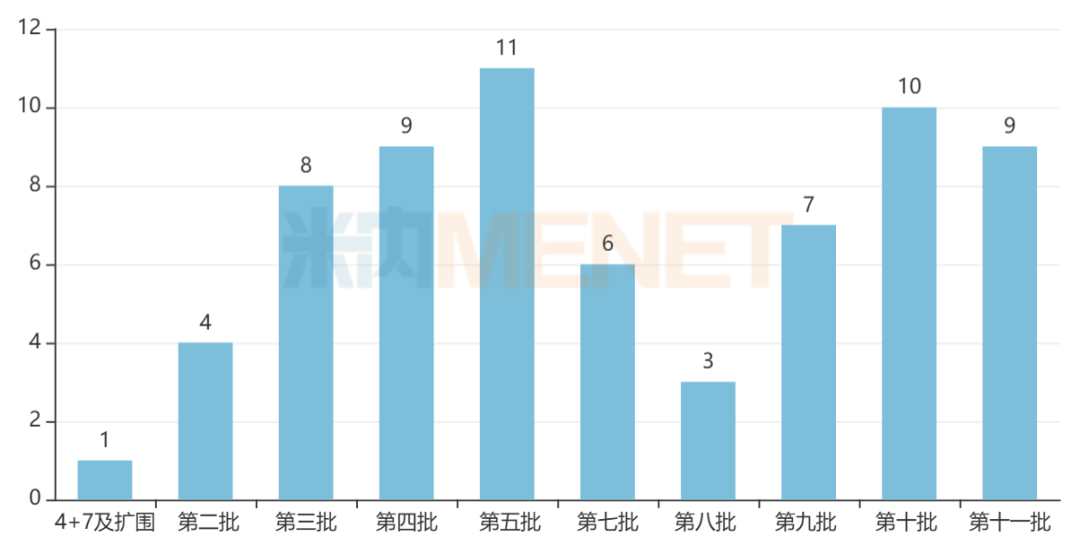 在国家已开展的十批十一轮化药集采中,消化系统及代谢化药分别有1个、4个、8个、9个、11个、6个、3个、7个、10个、9个品种被纳入其中,合计68个品种(以通用名计,帕洛诺司琼注射剂按不同批次重复计算),是纳入化药国采品种数排名第三的治疗大类。