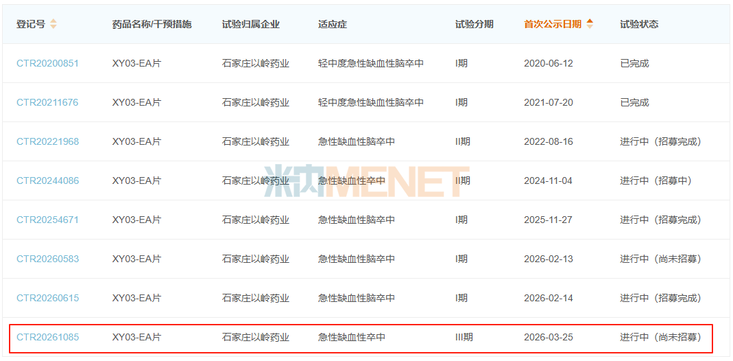 米内网数据显示,以岭药业在2019年获得了化药1类新药XY03-EA片的临床批件,2020年启动I期临床,2026年3月下旬该新药的急性缺血性卒中III期临床正式启动。