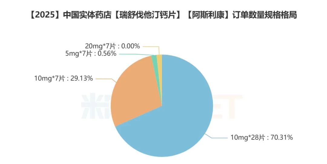按订单数量统计包装规格占比,10mg*28片最为畅销,2025年占比高达70.31%;其次是10mg*7片,占比达29.13%。对于慢病药而言,大包装更受消费者欢迎。