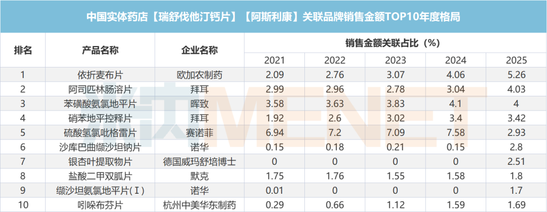 销售金额关联占比品牌方面,以进口品牌为主。从具体排名看,2025年排名第一的是欧加农的依折麦布片,为5.26%;其次是拜耳的阿司匹林肠溶片,为4.03%。