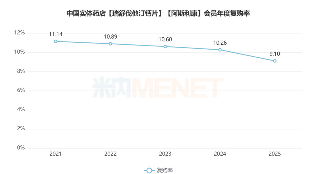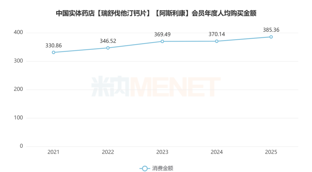 虽然复购率下滑,但会员年度人均购买金额持续上升,2025年人均消费385.36元。