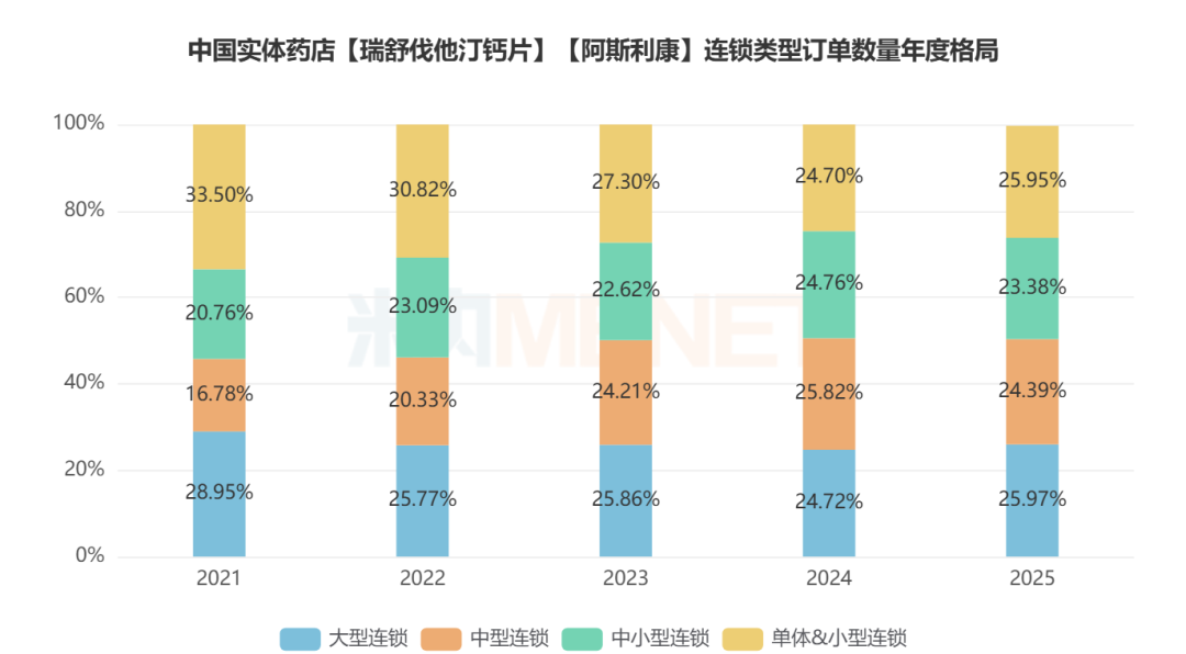 在订单数量连锁类型分布方面,2025年各类型连锁的占比相对平均。从近5年的变化看,单体&小型连锁面临较大压力,中型连锁在快速抢占市场。