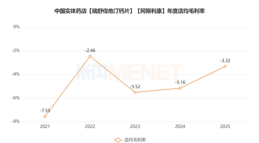 店均毛利率近5年来均为负数,2025年为-3.32%。对于药店来说,是一个吸引客流的单品。