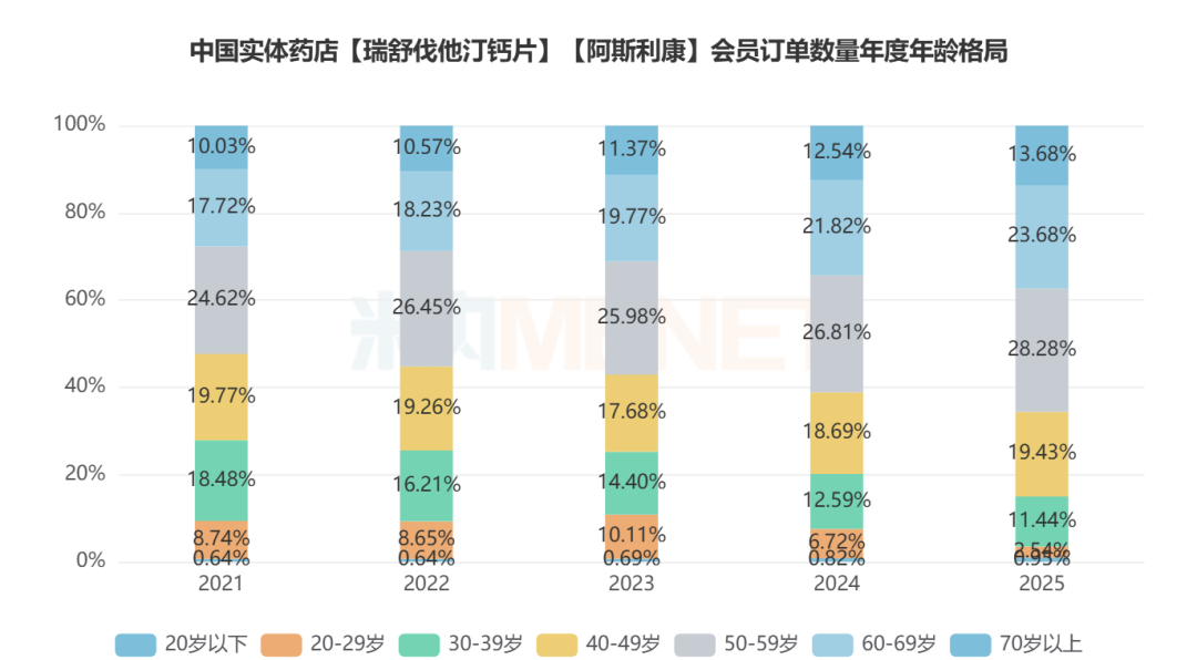 在会员年龄销售金额分布方面,2025年可定的消费者中,年龄为“50-59岁”和“60-69岁”的群体相对较多,占比均超过24%。此外,“60-69岁”和“70岁以上”的群体占比呈逐年上升态势,可见高龄群体的用药需求强劲且稳定。