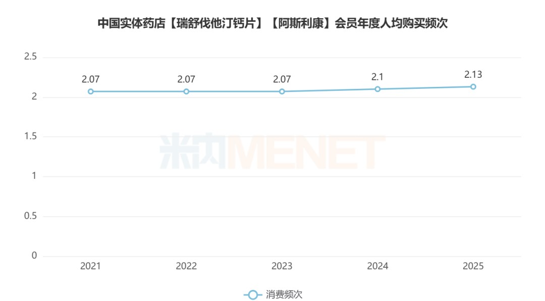 会员年度人均购买频次较为稳定,保持在2次左右,可见该药的消费者更倾向于“一年2次”的大额购买。