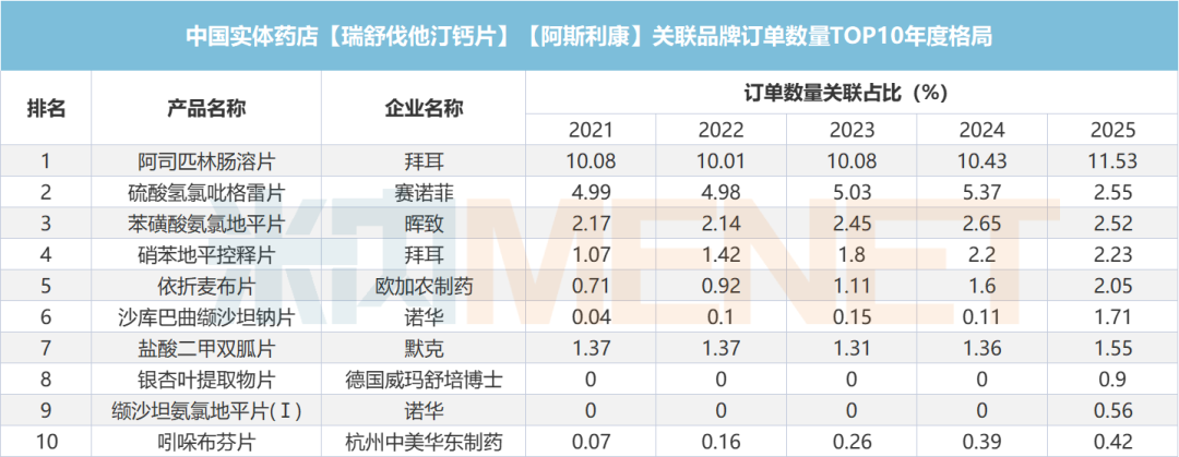订单数量关联占比品牌方面,亦以进口品牌为主,排名第一的是拜耳的阿司匹林肠溶片,为11.53%,占比较2024年有所提升,表明代谢综合管理需求增加。