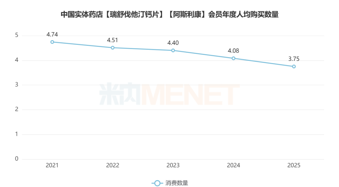 会员年度人均购买数量持续下降,2025年人均数量3.75盒,可能是消费者更倾向于购买大包装或组合装。