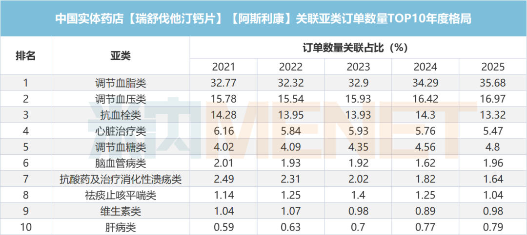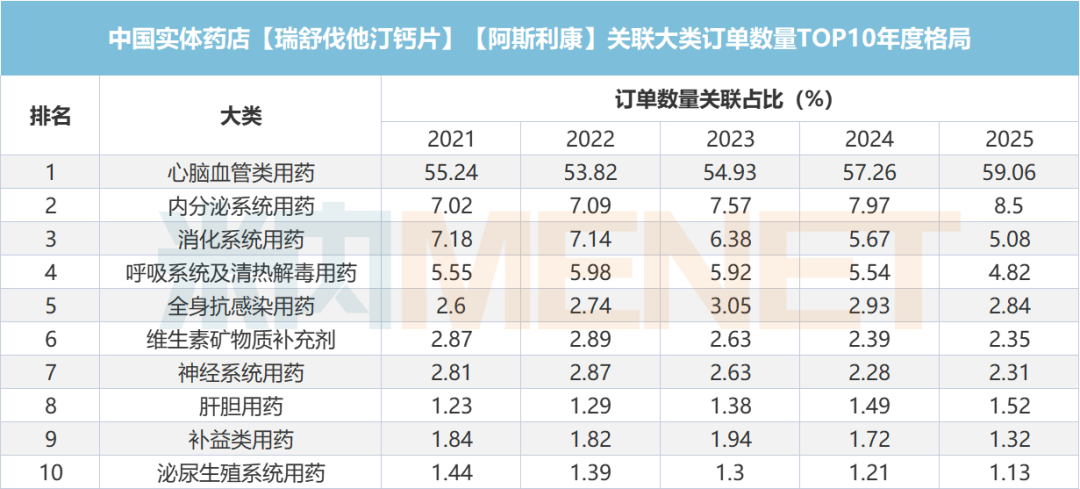 通过对不含一单一品的订单进行统计,可定订单数量关联占比大类还是其本身所在的心脑血管类用药为主,占比高达59.06%;内分泌系统用药以8.5%的占比紧接其后,且占比呈逐年递增态势。可见,降血脂的联合用药较为普遍,且正从“降脂单一用药”转向“代谢综合管理”。