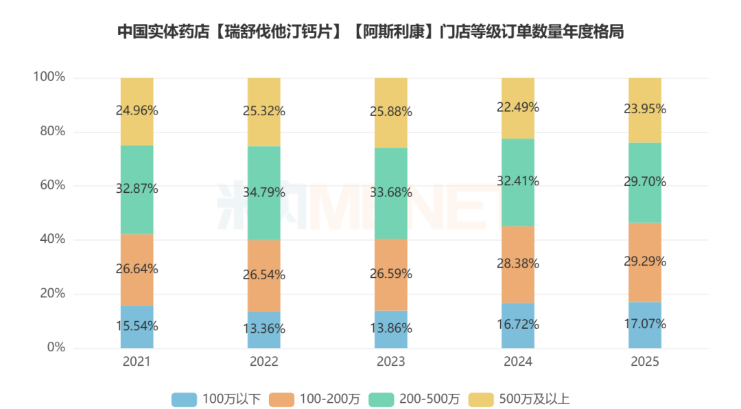 在订单数量门店等级分布方面,年销售额“100-200万”和“200-500万”的门店相对较多,2025年占比均超过29%。