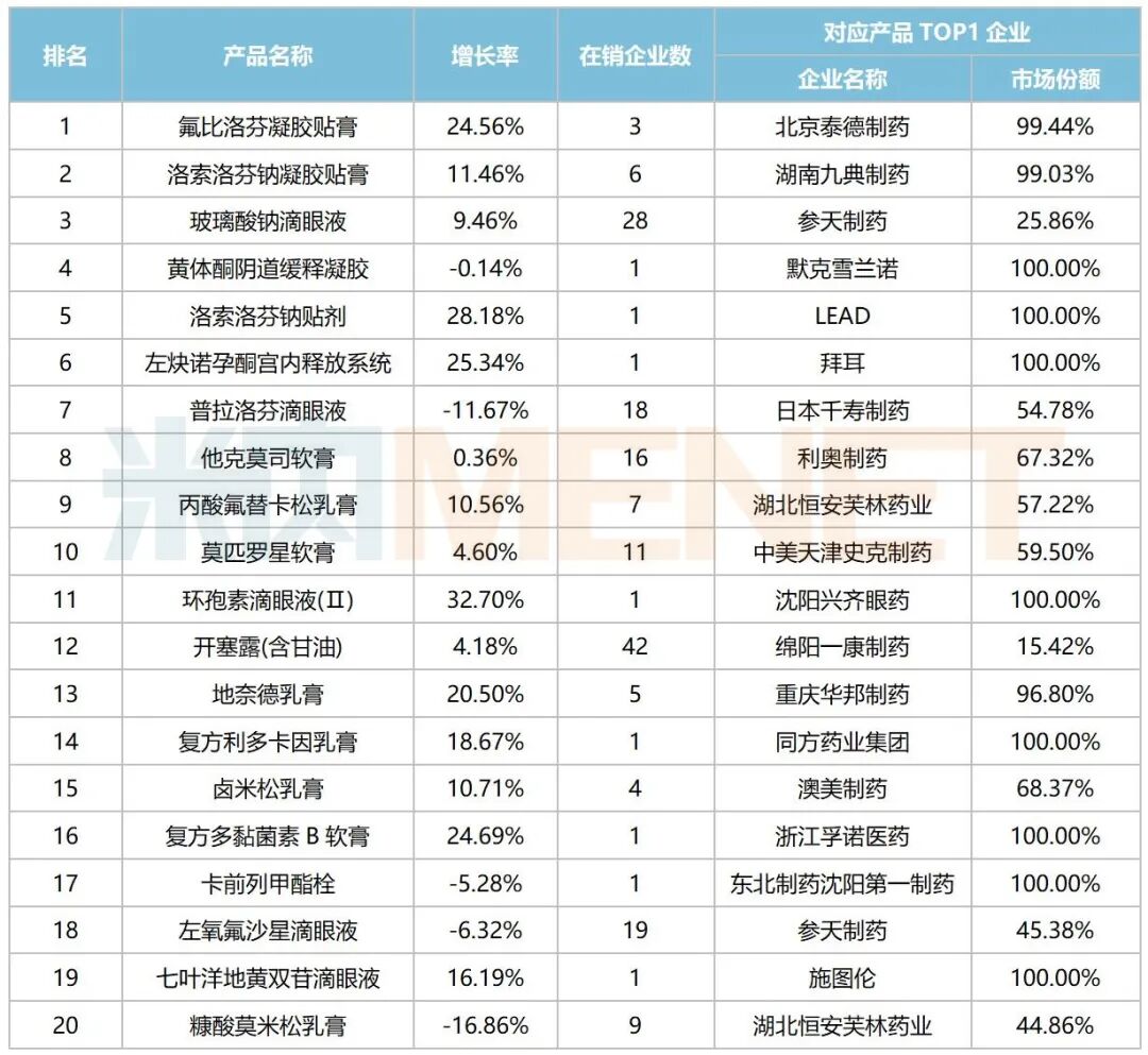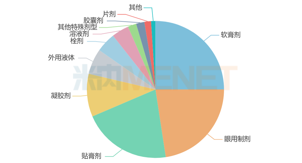 从用药剂型看,外用药(化药)集中在软膏剂、眼用制剂、贴膏剂三大剂型,2025年占比均超过20%;凝胶剂以约10%的占比排位第四,外用液体剂以约6%的占比排位第五。