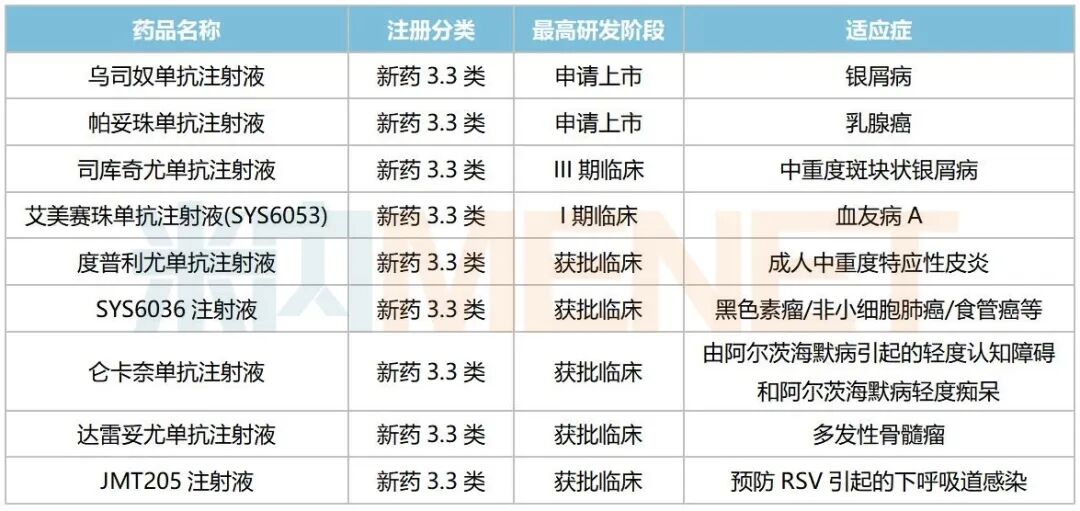 乌司奴单抗注射液、帕妥珠单抗注射液分别于2024年11月、2025年11月提交NDA获受理。其中,乌司奴单抗注射液是由强生开发的一款IL12/IL23抑制剂,帕妥珠单抗注射液是由罗氏开发的一款HER2拮抗剂,原研产品2025年在中国三大终端六大市场的销售额分别超过14亿元、22亿元。
