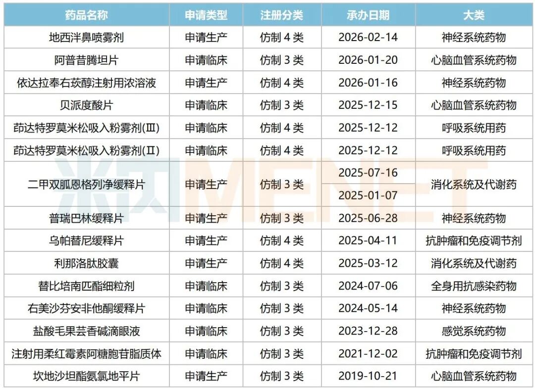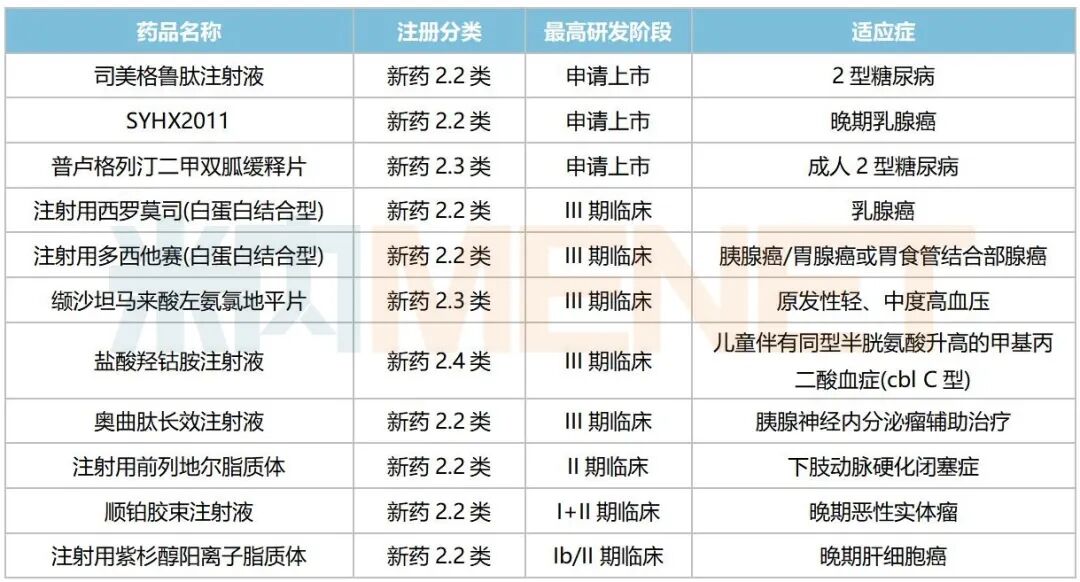 司美格鲁肽注射液、SYHX2011、普卢格列汀二甲双胍缓释片分别于2025年8月、2024年12月、2026年1月提交NDA获受理,有望于今年或明年迎来好消息。此外,注射用西罗莫司(白蛋白结合型)、注射用多西他赛(白蛋白结合型)、缬沙坦马来酸左氨氯地平片、奥曲肽长效注射液处于III期临床,目前均暂无企业拥有上述品种的生产批文。
