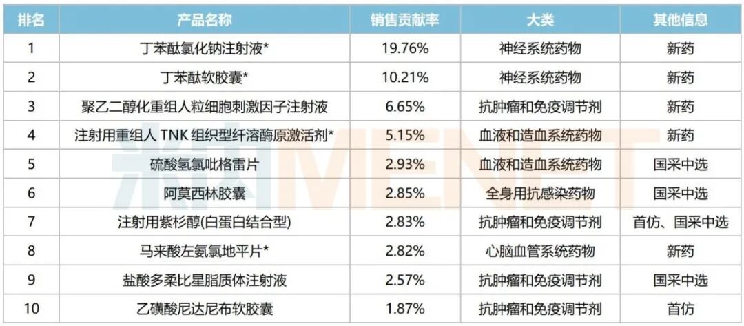 米内网数据显示,2025年中国三大终端六大市场(统计范围详见本文末)石药集团有30余个品种销售过亿。销售额TOP10产品中,新药占据“半壁江山”,其中丁苯酞氯化钠注射液、丁苯酞软胶囊依次位列第一、第二,销售贡献率均超过10%;排位第四的注射用重组人TNK组织型纤溶酶原激活剂同比大涨约308%,创新药正在加速补位中。