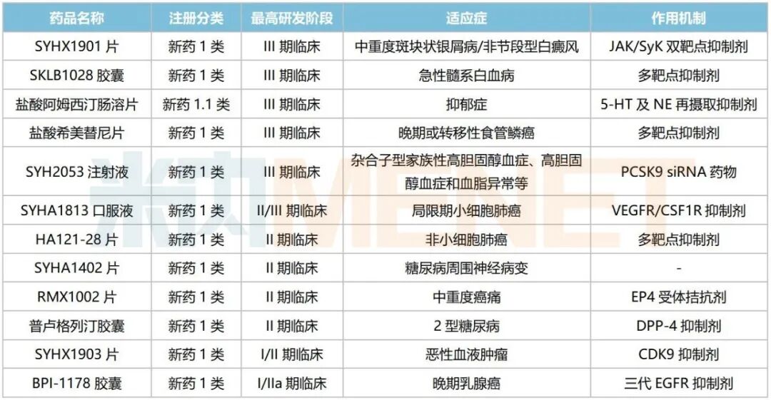 从研发进展看,SYHX1901片(JAK/SyK双靶点抑制剂)、SKLB1028胶囊(多靶点抑制剂)、盐酸阿姆西汀肠溶片(5-HT及NE再摄取抑制剂)、盐酸希美替尼片(多靶点抑制剂)、SYH2053注射液(PCSK9 siRNA)、SYHA1813口服液(VEGFR/CSF1R抑制剂)6款新药处于III期临床(含II/III期),上市可期。