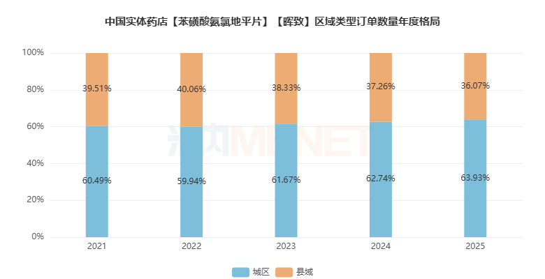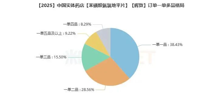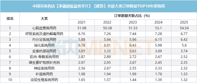 通过对不含一单一品的订单进行统计,络活喜订单数量关联占比大类还是其所在的心脑血管类用药,2025年占比高达54.54%,呼吸系统及清热解毒用药、内分泌系统用药分别以6.77%、6.42%分列二、三位。