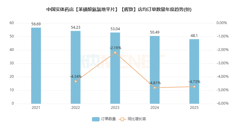 店均订单数量持续下滑,2025年为48.1份,同比下降4.73%。