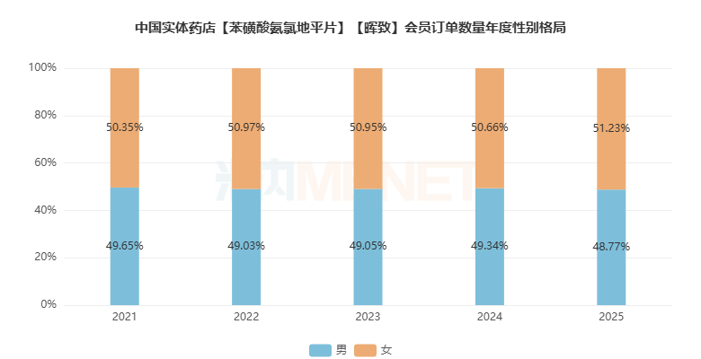 会员性别订单数量分布方面,女性的贡献度较高,2025年占比51.23%。