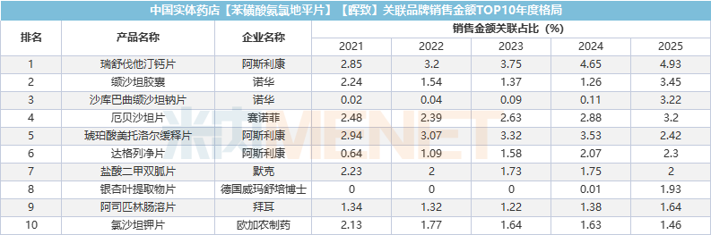 销售金额关联占比品牌方面,2025年排名第一的是阿斯利康的瑞舒伐他汀钙片,占比为4.93%。