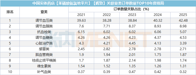 订单数量关联占比亚类方面,络活喜在调节血压类占比最大,2025年达42.48%,调节血脂类、抗血栓类占比均超过5%。