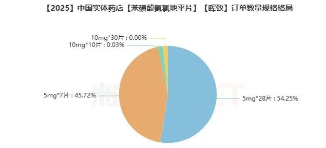按订单数量统计包装规格占比,5mg*28片和5mg*7片最为畅销,占比分别为54.25%、45.72%。