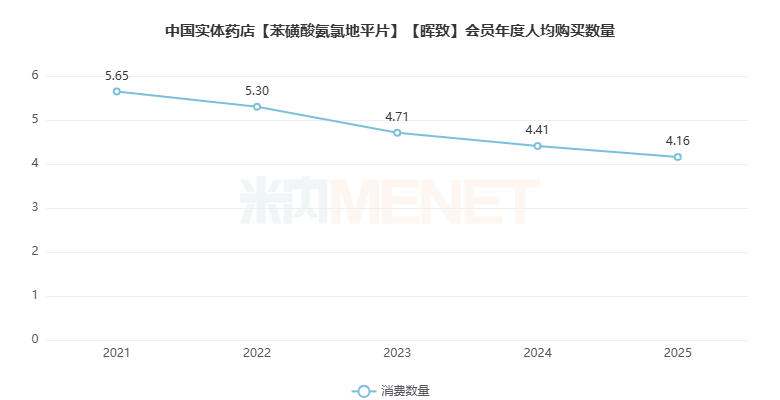 会员年度人均购买数量逐年下滑,2025年为4.16盒。