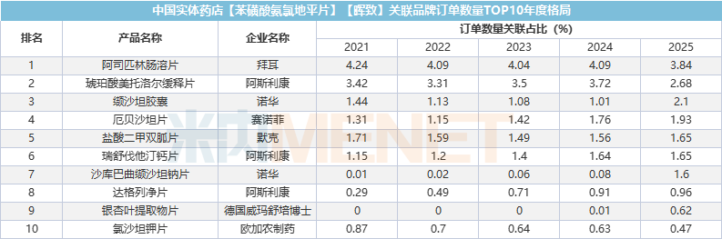 关联品牌订单数量来看,2025年排名第一的是拜耳的阿司匹林肠溶片,占比为3.84%。