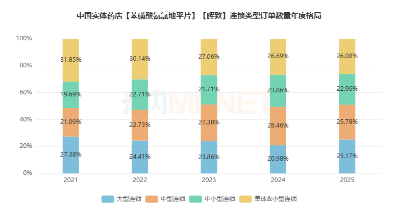 在订单数量连锁类型分布方面,单体&小型连锁占比虽然连续下滑,但2025年仍略胜一筹,达到26.08%。
