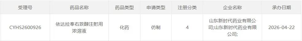 编辑说:日前,CDE官网显示,山东新时代药业的依达拉奉右莰醇注射用浓溶液以仿制4类报产获受理。米内网数据显示,依达拉奉右莰醇注射用浓溶液在近年中国公立医疗机构终端均超过20亿元销售规模,2025年同比增长22.54%,是神经系统药物(化+生)注射剂TOP4产品。
