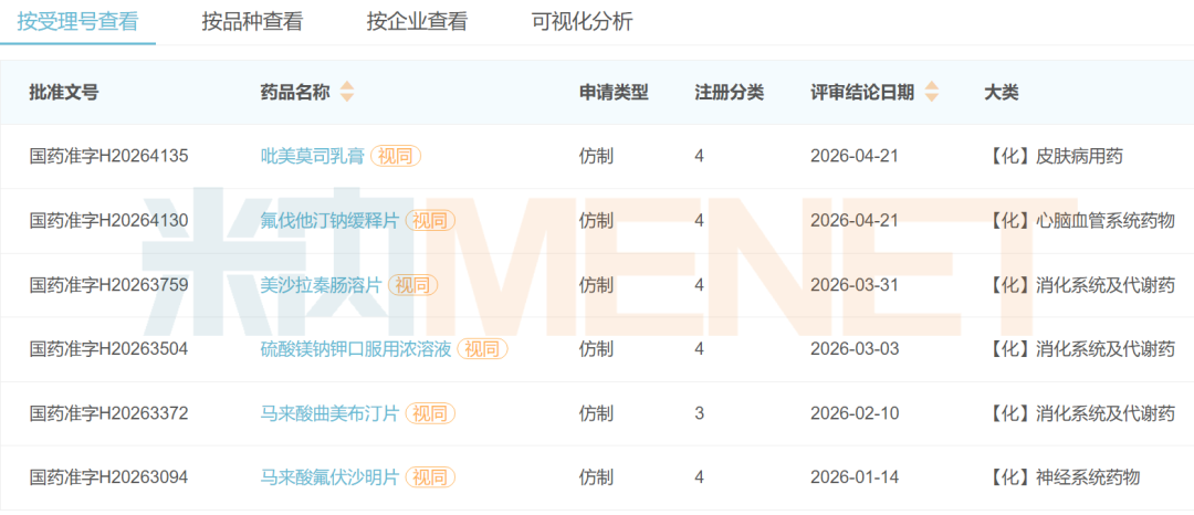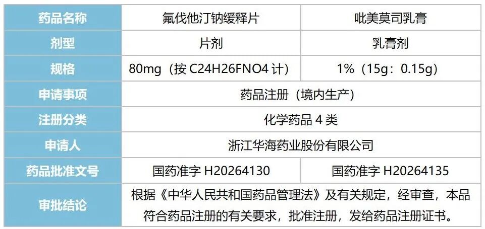 编辑说:4月28日,华海药业公告称,公司申报的2款仿制药获批生产并视同过评。其中,吡美莫司乳膏为公司获批的首款软膏剂,氟伐他汀钠缓释片为公司获批的首款血脂调节剂。米内网数据显示,2025年中国三大终端六大市场软膏剂、血脂调节剂销售额均超过150亿元。